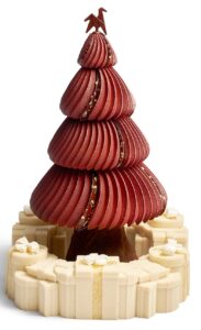 Avec Étoile d’hiver, Eddie Benghanem capture l’essence de Noël. Son sapin graphique en chocolat noir, découpé et assemblé à la main, fait de chaque création une pièce unique. Mêlant élégance et créativité, cette interprétation illumine la table des fêtes et invite à la contemplation avant la dégustation.