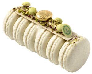 La célèbre maison revisite la pistache dans une bûche hommage aux macarons : biscuit moelleux, croustillant pistache, cœur fondant au praliné et fleur de sel, chantilly mascarpone légère et coque chocolat–vanille. Au sommet, une coque dorée et des éclats de macaron à la pistache prolongent le plaisir.