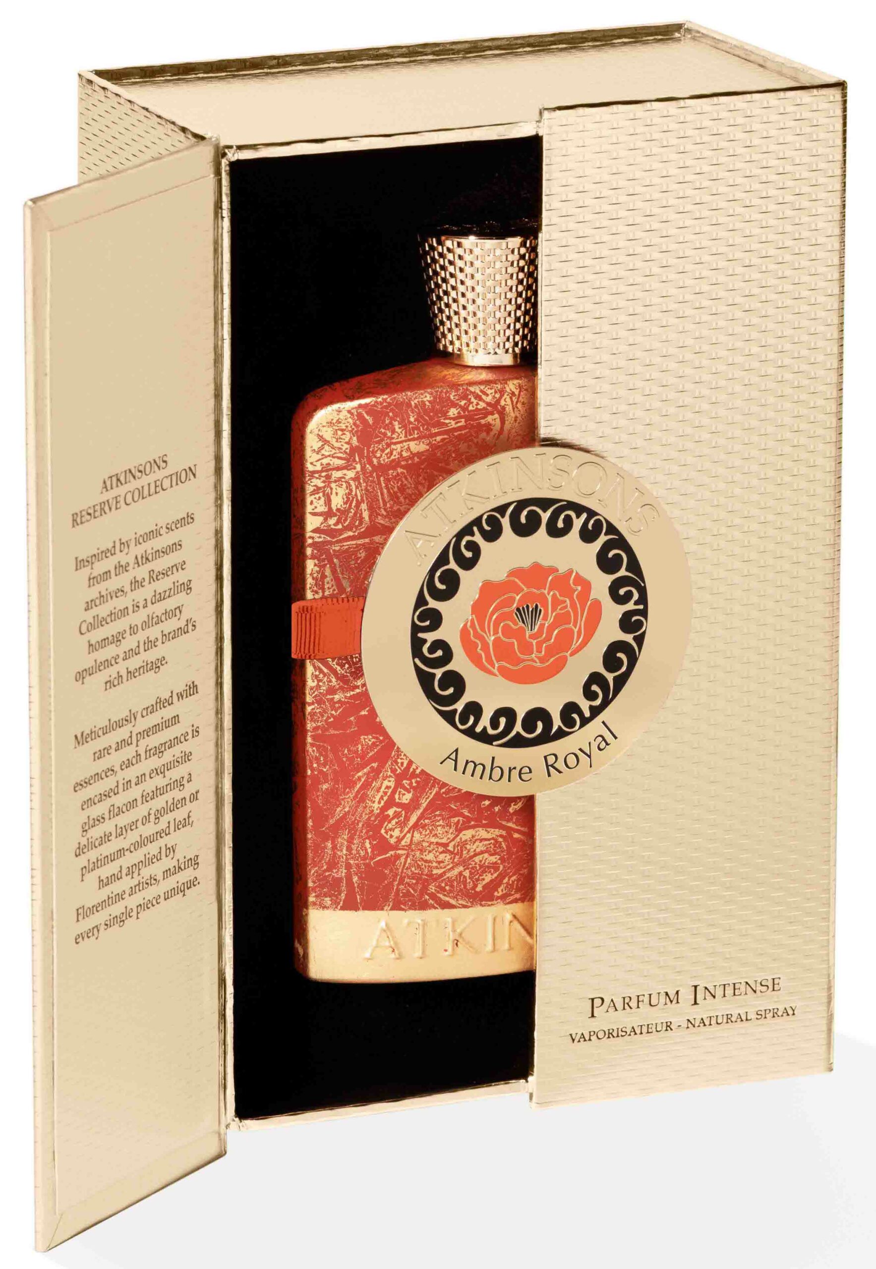 La composition gagne en mystère avec la présence du ciste labdanum et de l’huile d’encens, apportant une dimension presque spirituelle et méditative. En fond, un sillage luxueux se dessine : le vétiver de Madagascar dévoile des nuances cuirées et fumées, tandis que le santal diffuse une chaleur boisée, crémeuse et sèche, signant une élégance intemporelle. À la hauteur de ce jus d’exception, le flacon, peint à la main à Florence et délicatement orné d’or, est présenté dans un coffret sophistiqué. Plus qu’un parfum, Ambre Royal s’impose comme une signature olfactive précieuse, où héritage et modernité s’expriment avec une rare intensité. Flacon 100 ml (265 €) – www.atkinsons1799.com