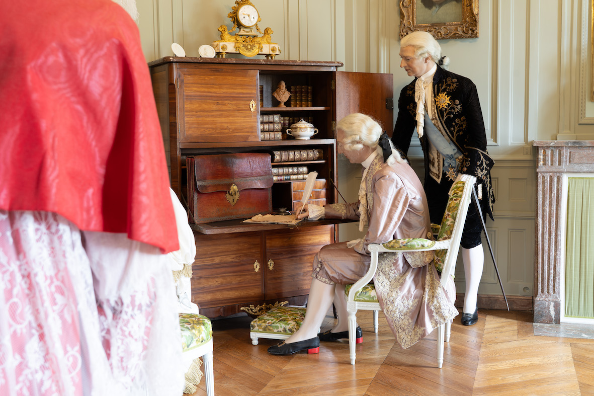 Les décors ont été réinventés, tout en restant fidèles à l’esprit des lieux. Le Salon des Quatre Saisons a retrouvé toute la richesse des arts décoratifs du XVIIIe siècle. Les tissus, inspirés des grandes manufactures, dialoguent désormais avec des tapisseries des Gobelins et un mobilier historique, notamment des pièces commandées pour le château dès 1771. L’ensemble compose un décor somptueux, aujourd’hui pleinement mis en valeur. Le boudoir Marie-Antoinette introduit, quant à lui, une dimension plus intime. Il évoque avec délicatesse l’arrivée de la dauphine en France. Entre objets personnels, souvenirs historiques et mise en scène sensible, se dessine en filigrane le lien étroit qui unissait la future reine et Louis XVI au baron de Breteuil, ministre d’État. La reconstitution du cabinet de travail de Louis XVI à Versailles restitue le faste du XVIIIe siècle, avec un tissu que l’on retrouve au château de Compiègne. Nous sommes en 1785 et s’y esquisse l’affaire du collier de la Reine, prémices des bouleversements à venir.