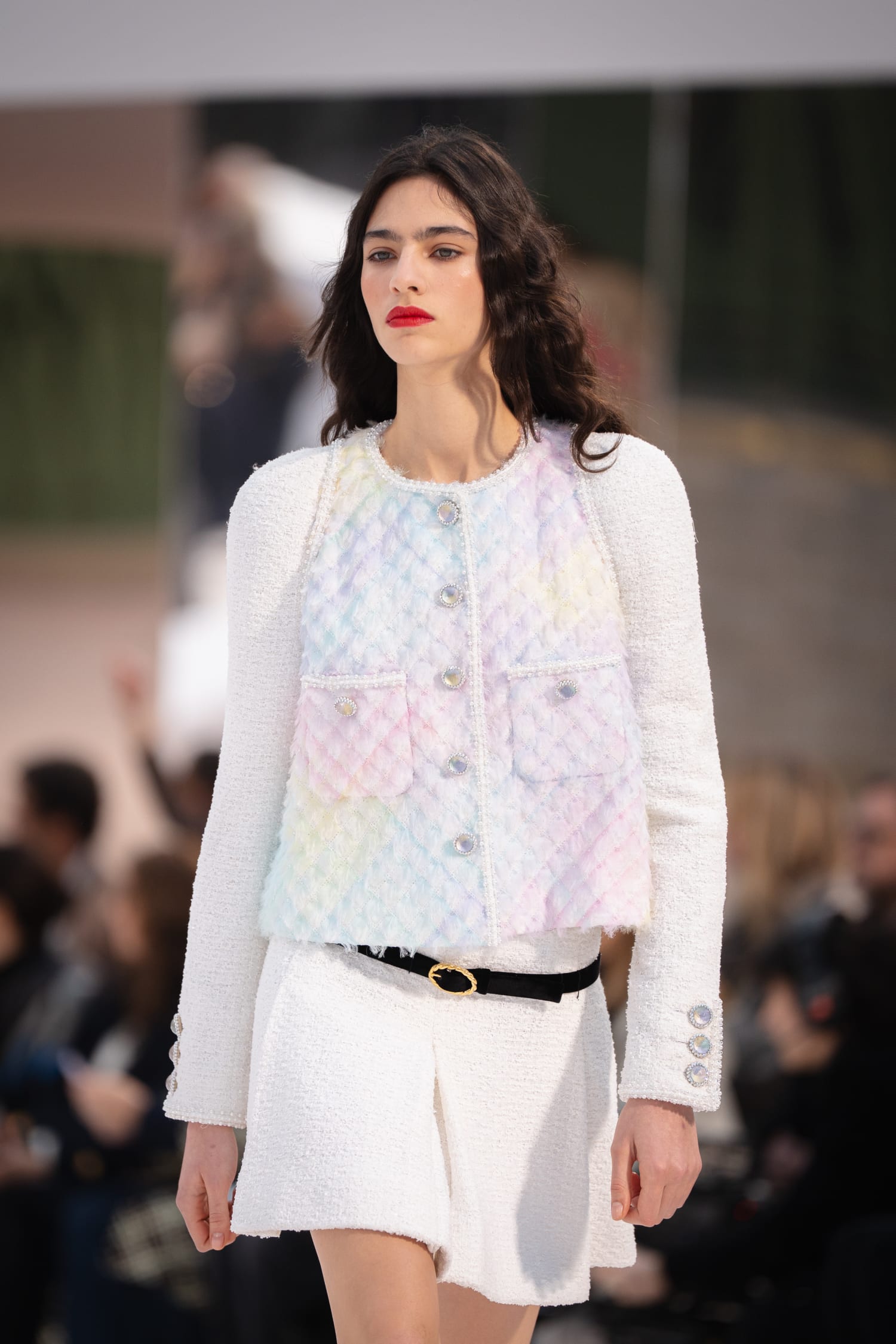 Les souliers, plats ou à talons, s’inscrivent dans cette logique chromatique. Bleu ciel, parme, crème ou blanc, ils prolongent la fluidité des silhouettes. Les doublures satinées, déclinées en teintes éclatantes comme le rose, le vert ou le bleu roi, insufflent une gaieté subtile à chaque pièce, tandis que les boutons en cristal de roche, métal et strass se transforment en astres et camélias, clin d’œil aux symboles chers à Gabrielle Chanel.
