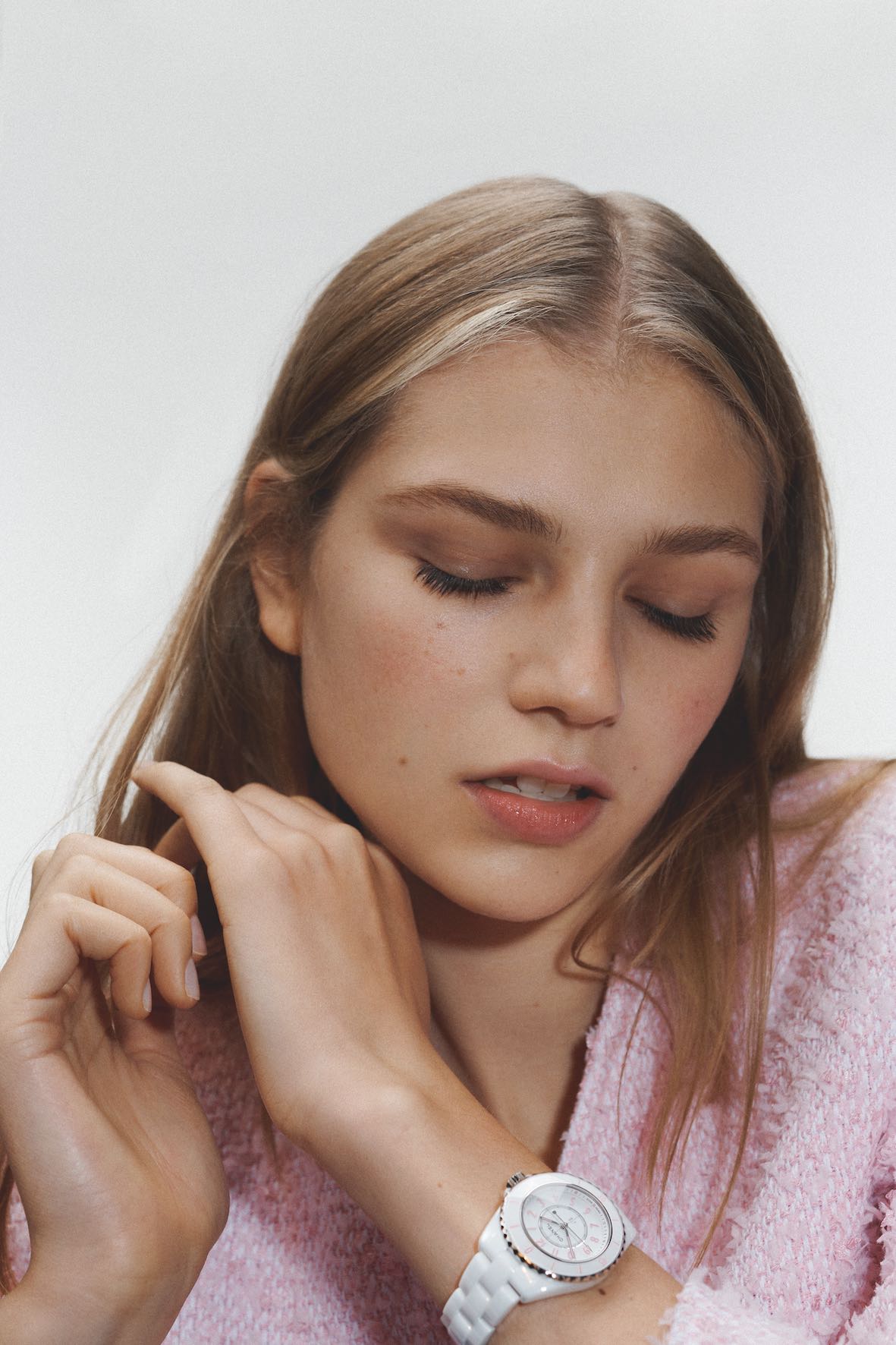 La montre J12 Pink Blush est dotée d’un boîtier en céramique haute résistance blanche et acier de 33 mm. Celui-ci est muni d’une lunette tournante unidirectionnelle en acier et saphir verni blanc avec touches de rose poudré, et d’une couronne vissée en acier avec cabochon en céramique blanche. Le cadran laqué blanc dispose d’un index en céramique rose poudré. Fonctions : heures, minutes, secondes. Mouvement quartz de haute précision. Bracelet en céramique blanche avec boucle triple déployante en acier. Etanchéité : 200 mètres (5 250 €) www.chanel.com