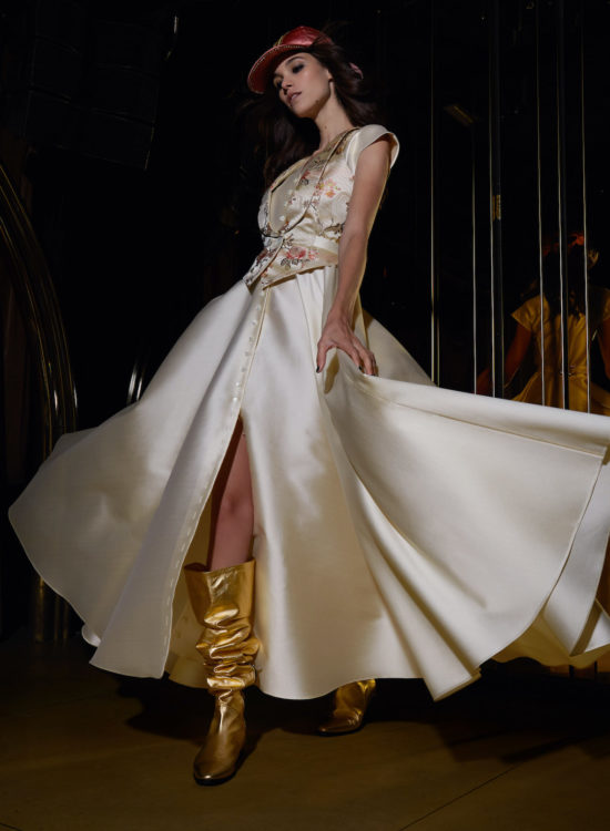 Avec sa dernière collection prêt-à-porter printemps-été baptisée «Dance Machine», Alexis Mabille nous entraîne sur le dancefloor. Le créateur a imaginé des robes légères, virevoltantes en taffetas de soie à porter avec des casquettes de baseball en satin inscrustées de pierreries et des cuissardes dorées… pour être la plus belle pour aller danser.