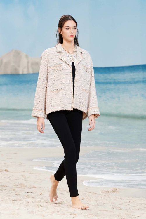 Les couleurs sont lumineuses : jaune ensoleillé, sable doré, beige tan, rose, bleu, menthe glaciale et blanc nacré côtoient le bleu marine et le noir. Un imprimé parasol sur mousseline, des plumetis multicolores saupoudrés sur le tweed, des broderies de sable ou de coquillages : l’atmosphère est joyeuse. L’allure est définie par une élégance sophistiquée au travers d’une sélection de matières courant du tweed à la mousseline, en passant par le crêpe, la dentelle, le sergé de coton, le denim, le cuir et la popeline. Le tailleur s’appuie sur de nouveaux volumes : aux vestes à épaules larges et manches évasées répondent des jupes fendues sur le côté et ouvertes sur des minijupes, ou des pantalons oversized dézippés. Les combi-pantalons aux jambes XL tranchent avec les ensembles à veste courte ou blouson et petite robe de tweed. La veste d’homme sort sur un cycliste à bustier ou un legging. Quant au denim, il s’affiche avec des cardigans cintrés ou des nageurs à l’épaule asymétrique. Le jour comme le soir, les robes débardeur sortent en tweed blanc rayé ou brodé de parasols pailletés ou en tweed sable piqueté de sequins. D’autres sont nouées sur le buste à la manière d’un drap de plage et retenues par des bretelles colliers de coquillages. Des tuniques oversized à large encolure sont ouvertes dans le dos. En tweed menthe ou beige, en soie froissée sable doré, elles s’ouvrent sur un short assorti.