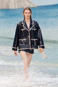 Les rayures des cabines de plage s’affichent sur des robes superposées en crêpe georgette incrusté de jours échelles en dentelle. Une fluidité aérienne que l’on retrouve sur de longues robes en mousseline imprimée de parasols bicolores et sur un ensemble en dentelle. Semblable à une trainée de sable, une broderie de paillettes dorées dessine des sillages délicats sur un tailleur de tweed blanc nacré et sur des robes en crêpe georgette marine. Le ciré des orages d’été est réinventé quant à lui à la façon d’un pardessus évasé en dentelle plastifiée. Avec humour, Karl Lagerfeld détourne les robes cabines de plage ; devenues des « robes cabanes », elles s’habillent de tweed rose à plumetis multicolore et de volants de dentelle. Le soir, elles reviennent parées d’origamis de rubans de mousseline. Le créateur fait exploser un kaléidoscope de parasols pailletés sur une robe bustier et scintiller des palmiers pailletés sur une robe cage en mousseline noire. Une autre est ornée de noeuds et rubans de satin.