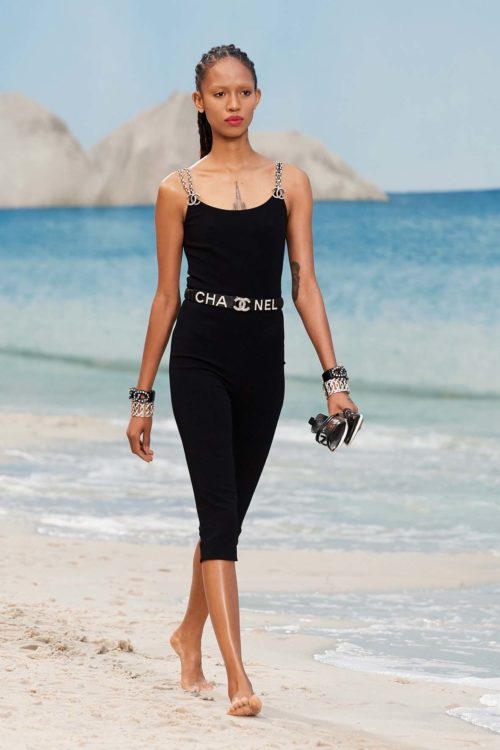 Sur les accessoires, Chanel est scindé en deux syllabes distinctes. On se coiffe de casquettes à double visière, de grands chapeaux de paille frangée, on accumule les sautoirs, les pendentifs, les colliers de perles et on multiplie les manchettes XXL. Une décontraction accentuée par des mules à petits talons en plexiglas ou posées sur une semelle en liège. Les sacs 11.12 s’habillent de tweed et de galons, ou de broderies parasols. Le Boy Chanel revient en sacoche en cuir et patchwork de tweed. D’autres sacs appelés side packs se portent en duo, croisés sur chaque hanche, induisant un nouveau porté. Les sacs à rabat passent en éponge ou s’accrochent à une poignée de perles XL. Des grands sacs de plage en denim et paille aux sacs filets multicolores, en passant par les camera case en cuir et osier complètent la collection. Les minaudières, enfin, prennent la forme de coquillage ou de petits ballons de plage.
