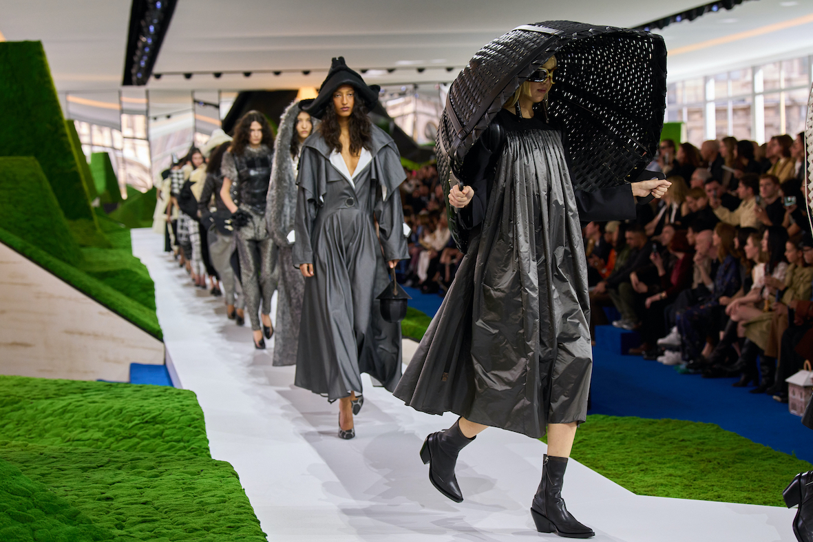 L’hyper-artisanat, signature de la maison, est omniprésent. Les innovations technologiques rencontrent le savoir-faire traditionnel : impressions tridimensionnelles, résines sculptées et cuirs travaillés donnent naissance à des boutons évoquant des minéraux ou à des talons inspirés de bois de cerf. Des fourrures végétales inventent de nouvelles textures, tandis que certains cuirs sont creusés de sillons et tannés pour reproduire l’apparence du bois tout en conservant une souplesse inattendue.