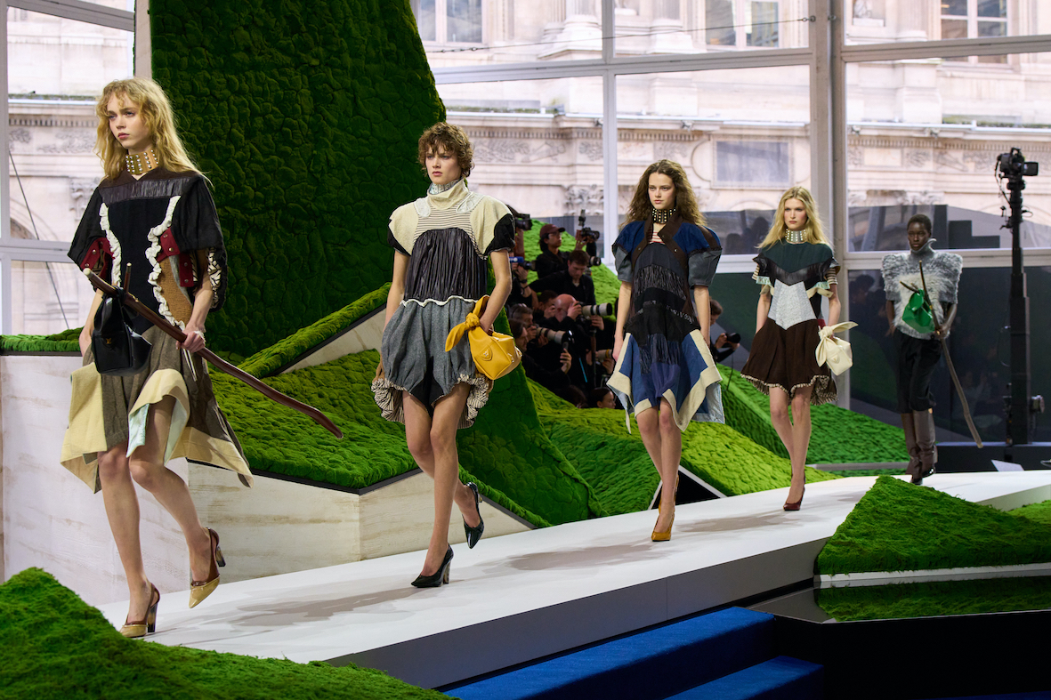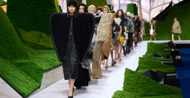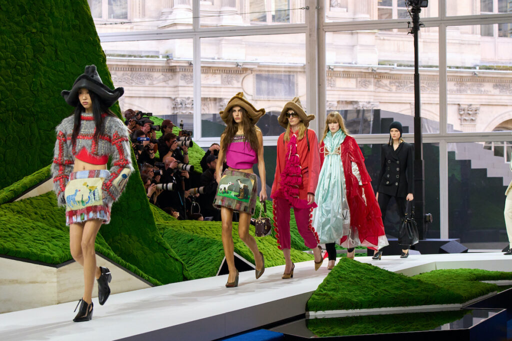 Dans la Cour Carrée du Musée du Louvre, à Paris, la maison Louis Vuitton a présenté sa collection Femme Automne-Hiver 2026 imaginée par son directeur artistique Nicolas Ghesquière. Pour l’occasion, la scénographie signée Jeremy Hindle a transformé la célèbre cour du Louvre en un néo-paysage futuriste où nature et science-fiction dialoguent. Dans ce décor spectaculaire, les silhouettes ont défilé comme dans une peinture vivante, inspirée d’une nature réinventée pour le XXIᵉ siècle.