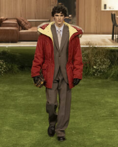 La silhouette du future dandy imaginée par Pharrell Williams puise dans les fondations du vestiaire masculin tout en convoquant une nostalgie rétro-futuriste inspirée des années 1980. Tailoring assoupli, volumes nonchalants, parkas à l’esprit vintage, costumes réversibles et superpositions techniques composent une élégance décontractée, à la fois familière et résolument contemporaine. Les teintes classiques du vestiaire masculin s’animent de rouges, d’oranges et de bleus vibrants, comme un écho aux visions futuristes d’hier.L’illusion devient un langage à part entière. Trompe-l’œil textiles, fausses apparences et matières détournées brouillent les repères : la soie imite le nylon, la laine se fait néoprène, le vison se donne des airs d’éponge. Avec le temps, certains Monogrammes apparaissent, révélés par la patine, inscrivant le vêtement dans une temporalité vivante et évolutive.
