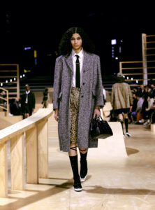 La collection imaginée par Maria Grazia Chiuri a été dévoilée, telles une poésie visuelle, une conversation entre l’héritage de Dior et la constellation en constante évolution qu’est le monde contemporain. Cette ligne se compose de jupes plissées, de kilts noir et blanc, mais aussi de vestes qui se conjuguent au masculin pour repenser l’iconique veste Bar, de manteaux pour homme et de jupes ultracourtes, de shorts de cycliste assortis à des chemisiers blancs et des cravates noires, de broderies en 3D révélées par l’utilisation de la maille, d’un captivant zodiaque pixélisé à la façon d’un jeu vidéo. Une série de robes du soir, spécialement conçues pour le show, reprennent les volumes des silhouettes emblématiques du couturier-fondateur – à l’instar du modèle Junon –, réinventés par des coupes asymétriques, irrésistiblement audacieuses. DiorDes looks qui expriment des concepts plus que jamais inspirants, tels que la participation, la communion et le partage.