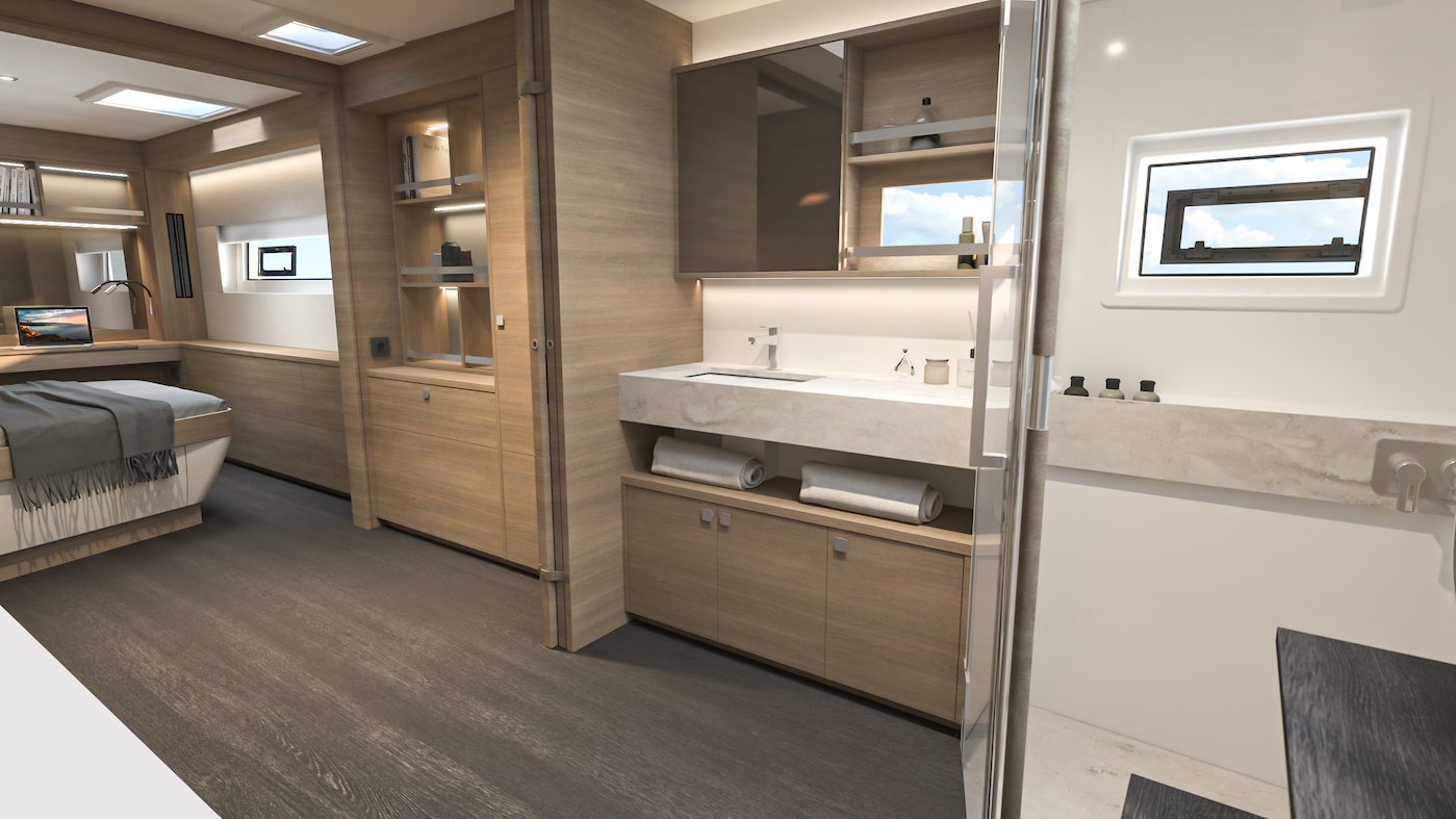 Le carré, modulable et spacieux, connecte les espaces tout en préservant une intimité propre à chacun. Que ce soit en version cuisine ou bar, il bénéficie d’une abondante lumière naturelle grâce à ses vitrages verticaux. La cabine propriétaire à tribord, un véritable havre de paix, offre une luminosité exceptionnelle et une salle de bain reliée au cockpit arrière.