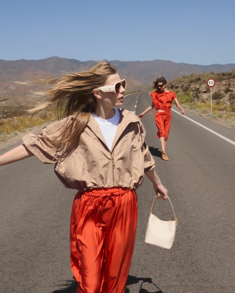 Pensées pour toutes les escales, blouses, jupes, chemisiers, tee-shirts et parkas aux détails élastiqués s’illuminent de teintes mandarine, rosé, sable, terre de Sienne et blanc. Confectionnées en popeline de coton, taffetas fluide imprimé et soie lavée poids plume, ces pièces offrent une totale liberté de mouvement.