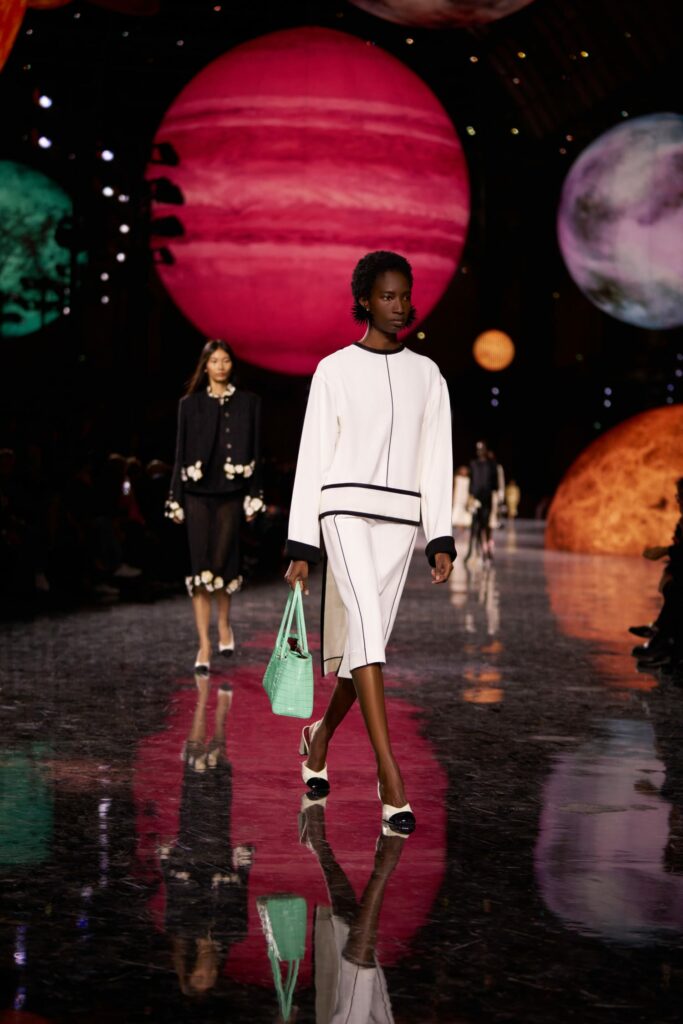 Le sac 2.55 se porte avec désinvolture, les camélias se froissent avec grâce, les tweeds s’effilochent avec douceur. En noir et blanc, les silhouettes évoquent l’architecture de la Maison et l’Art déco, rappelant que chez Chanel, l’élégance est affaire de structure et de mouvement.