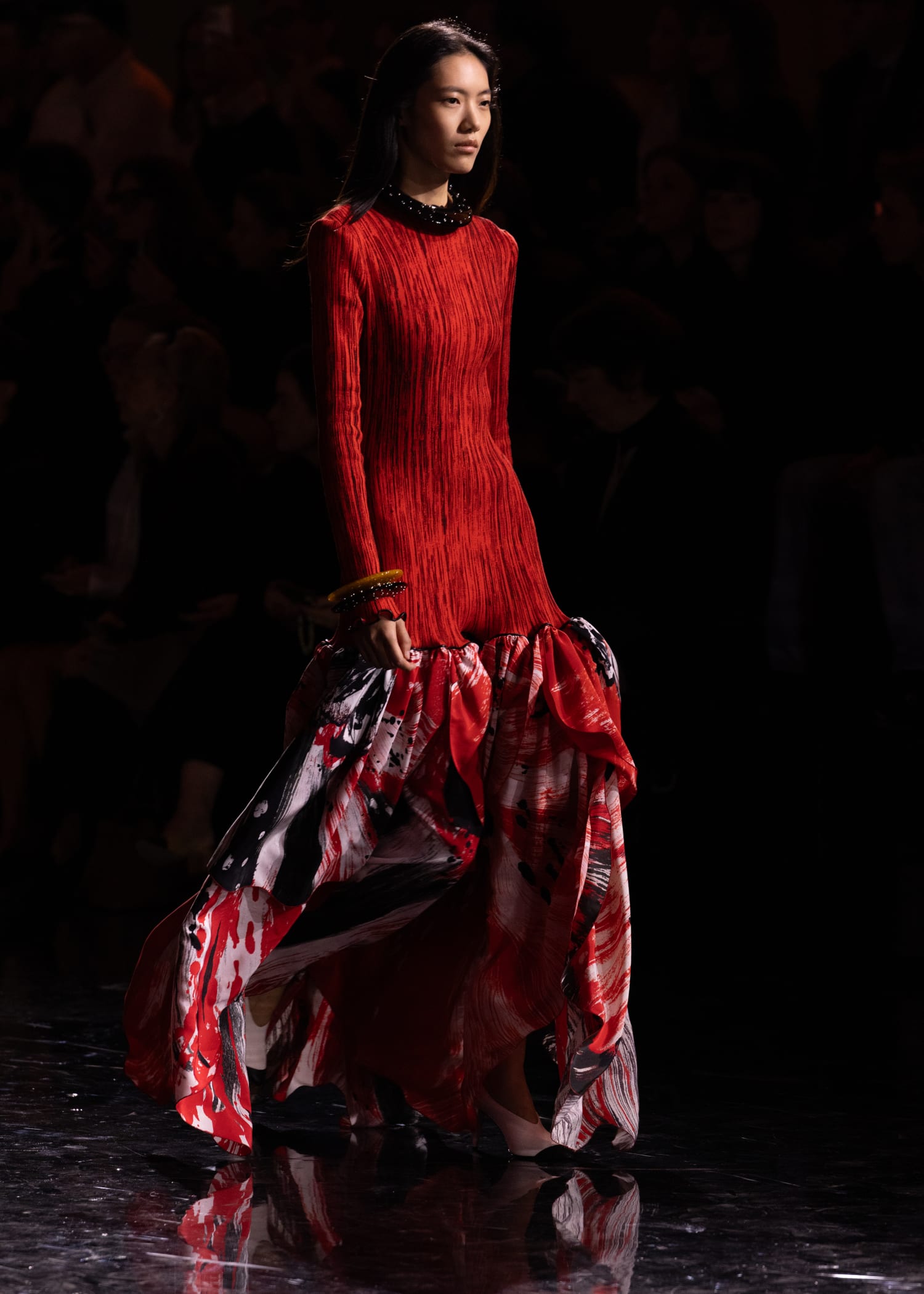 Puis vient l’universalité : celle d’une silhouette qui transcende les frontières, d’un langage mode en expansion. Les lignes masculines se font souples, les matières dialoguent avec la lumière. Les doublures de soie imprimée, les mailles nouées à la main, les bijoux opulents et les souliers à bout contrasté traduisent un savoir-faire d’exception et une idée du futur enracinée dans le passé.