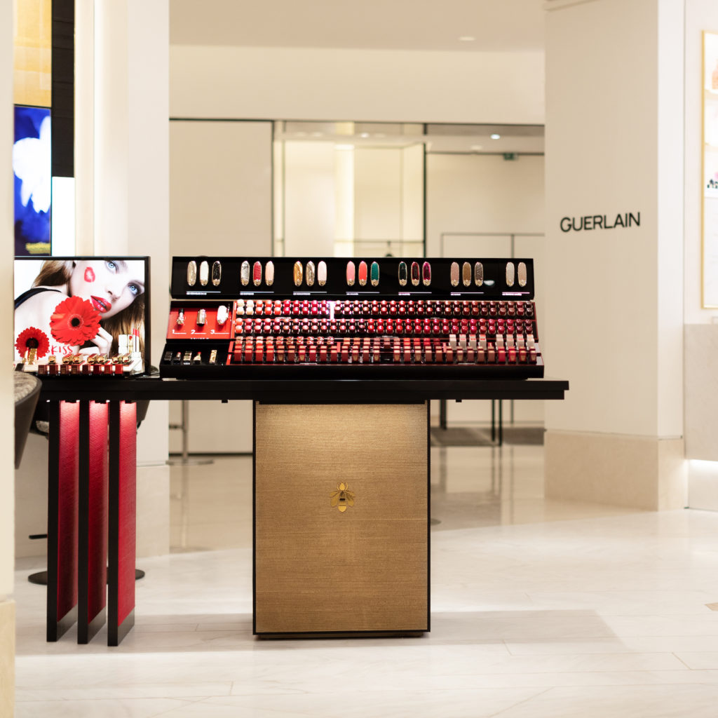 Fort de son héritage, de son expertise et de son audace créative, porté par son engagement durable, Guerlain réinvente progressivement ses boutiques dans le monde entier. Dans ce nouvel espace, l’architecture a été entièrement repensée par Patricia Grosdemange, Directrice Artistique Architecture et Design : «J’ai rêvé d’un lieu où l’on vive la création et où l’on se sente bien, baigné dans une lumière douce, mais avec un souci d’exigence à la hauteur de la perfection des produits». Ici, le design est pur et luxueux, mais sans ostentation. Les lignes courbes ou rectilignes sont sobres et graphiques. Les matériaux précieux, naturels et texturés, ont été choisis avec le même soin que les actifs cosmétiques ou les ingrédients des parfums. Les nuances sont douces et chaudes, d’un béton teinté de nude rosé par des pigments naturels, vibrant et doux comme une peau au bois naturel noir. Les étagères rétro éclairées mettent en lumière, de façon majestueuse, les flacons Abeilles, dorés ou colorés. Le jeu des textures est finement étudié : d’un marbre finement veiné à un bois clair avec placage en relief ou noirci et griffé, de l’or -brillant, brossé ou patiné- au bleu nuit, clin d’œil à Orchidée Impériale, jusqu’aux textiles subtilement dorés sur les murs et les sièges. Même les codes précieux de la Maison, Abeille et Double G, s’invitent élégamment dans l’architecture, comme des poinçons, pour signer murs ou mobilier.