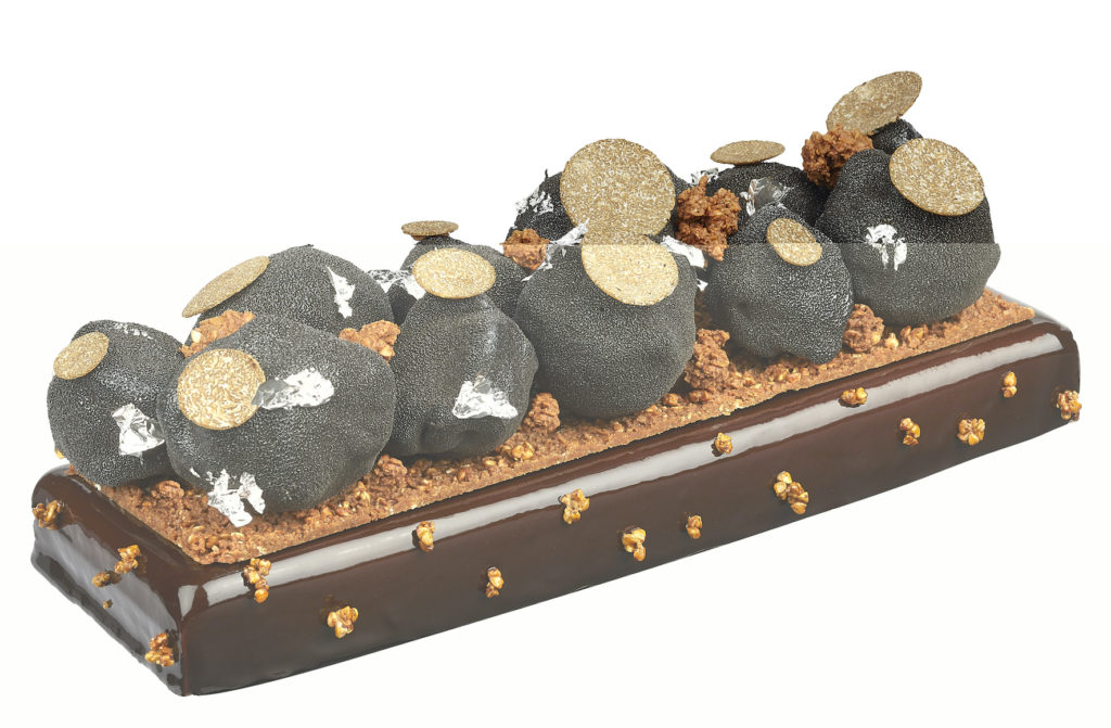 Prince de Galles. Le Chef Pâtissier Tristan Rousselot a réalisé la parfaite imitation d’une bûche consumée avec un flocage au charbon végétal et une mousse de sucre noir. Très aérienne, elle dévoile un insert crémeux caramel, tandis que le biscuit moelleux au miel de sapin contraste avec le croustillant riz soufflé. Socle en chocolat noir Haïti «Cuvée du Sourceur» Valrhona. Réservation 48 h à l’avance : www.marriott.fr . Bûche « Tison » (75€).